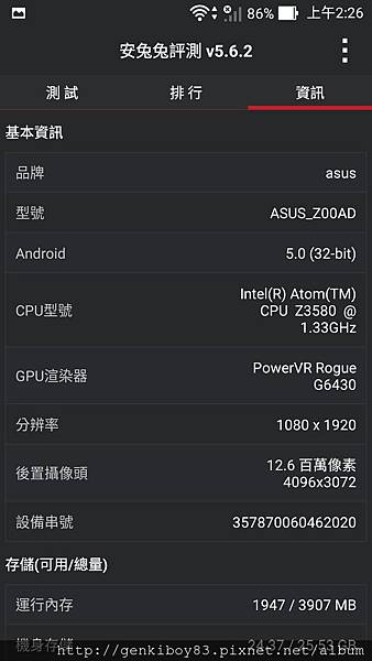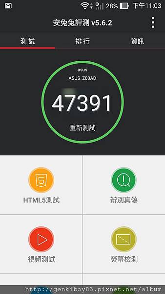 最後來跑一下安兔兔,4GB RAM版本的551ML採用的處理器是更高一階的Z3580,2GB版本是用Z3560但兩顆都是64位元的處理器,不過很可惜系統目前還是用32位元的版本,不知道之後更新會不會採用64位元的版本。安兔兔的跑分還滿驚人的,到了47000左右