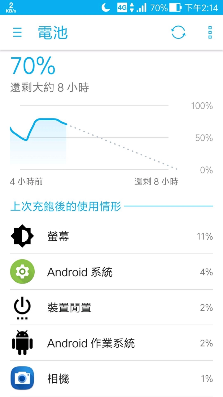 輕度使用,簡單看line還有fb,大概兩天充一次店前兩天忘記帶平板,就上下班大概約各約一個小時看影片,加上偶而看line+fb腕上回到家大概還有40%的電倒是之前有一次更新後後,非常耗電因為看不出是哪一個APP在耗電,所以將google play、google pay、google三個APP的資料清除後耗電問題就解決了ASUS手機被一、二代害慘了,老哥之前就是用二代的記得當時想法是這麼爛,不會想要用後來有用過ASUS平板,感覺還不錯,想說用看看zf4算蠻滿意的