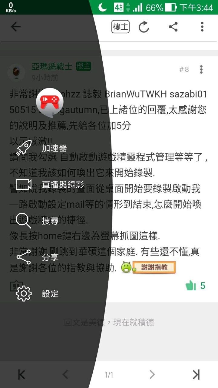 非常謝謝 neohzz 誌毅 BrianWuTWKH sazabi01 50515 springautumn,已上諸位的回覆,太感謝您的說明及推薦,先給各位加5分以示感激!!請問我勾選 自動啟動遊戲精靈程式管理等等了 , 不知道我該如何喚出它來開始錄製.譬如說我錄製的畫面從桌面開始要錄製啟動我一路啟動設定mail等的情形到結束,怎麼開始喚出遊戲精靈的捷徑.像長按home鍵右邊為螢幕抓圖這樣.非常謝謝,剛跳到華碩這個家庭. 有些還不懂,真是謝謝各位的指教與協助.