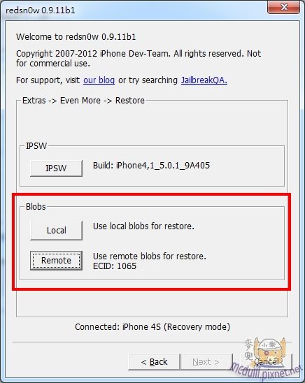 STEP10:過一下子的時間,Blobs裏的選項,就可以點選了,如果電腦上有備份SHSH的話,點選「Local」,如果沒有的話,點選「Remote」程式會自動幫您從Cydia撈回您的SHSH。因為小米沒有備份,所以選擇「Remote」。