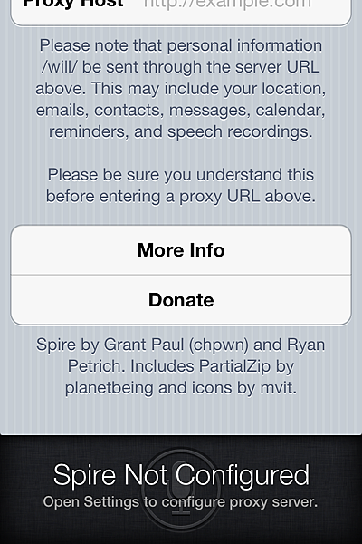 目前Spire已經登陸Cydia,用戶可以免費下載,大小為100MB。開發者表示由於文件大小的原因,建議用戶使用Wi-Fi網絡來下載,而不是用3G網絡。此前也有幾款工具發布,但是由於版權問題,這些工具並非合法的。 Chpwn表示:“Spire使用新的辦法來給Siri獲得文件,它不存在此前困擾我們的版權問題。”當然關於這類移植,用戶應該注意的是:用戶必須通過自己的服務器以及iPhone 4S獲得授權。Chpwn的解釋如下:但是Spire並不能夠完全解決這方面的問題。蘋果仍然要求用戶有授權才能夠使用Siri,所以來自iPhone 4S的信息仍然是必須。要插入此類信息,Spire允許用戶輸入自己的代理服務器地址。通過使用Siri代理服務器SiriProxy,用戶就可以使用iPhone 4S來設置一個代理服務器,方便輸入必須的信息。Steven Troughton-Smith表示:“在iPhone 4S被越獄之前,這是目前最佳的Siri移植方案。iPhone 4S被越獄之後,我們就可以避免代理服務器的的問題了。” 來自:威鋒網(weiphone .com)