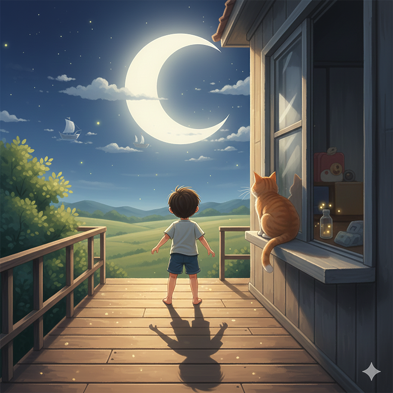 喜歡的人再給我拍手鼓勵~謝謝🙏夏天很長,長到午後的影子怎麼追也追不到。我赤腳跑過走廊,木地板還留著陽光的溫度。月亮在傍晚就偷偷出現,像一個提早放學的朋友。貓咪坐在窗台,看我把雲當成船,把明天當成永遠不會來的事。蟬聲填滿空氣,大人們的話被風吹得很遠很遠。只剩下笑聲在口袋裡叮噹作響。夜晚降臨時,我和貓一起抬頭,月亮變得很近,近到好像伸手就能帶走。那一年,夏天沒有結束,童年也沒有名字。