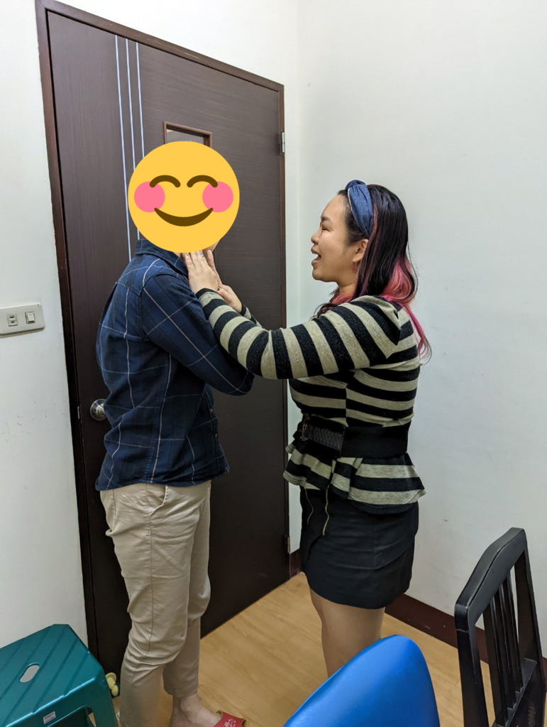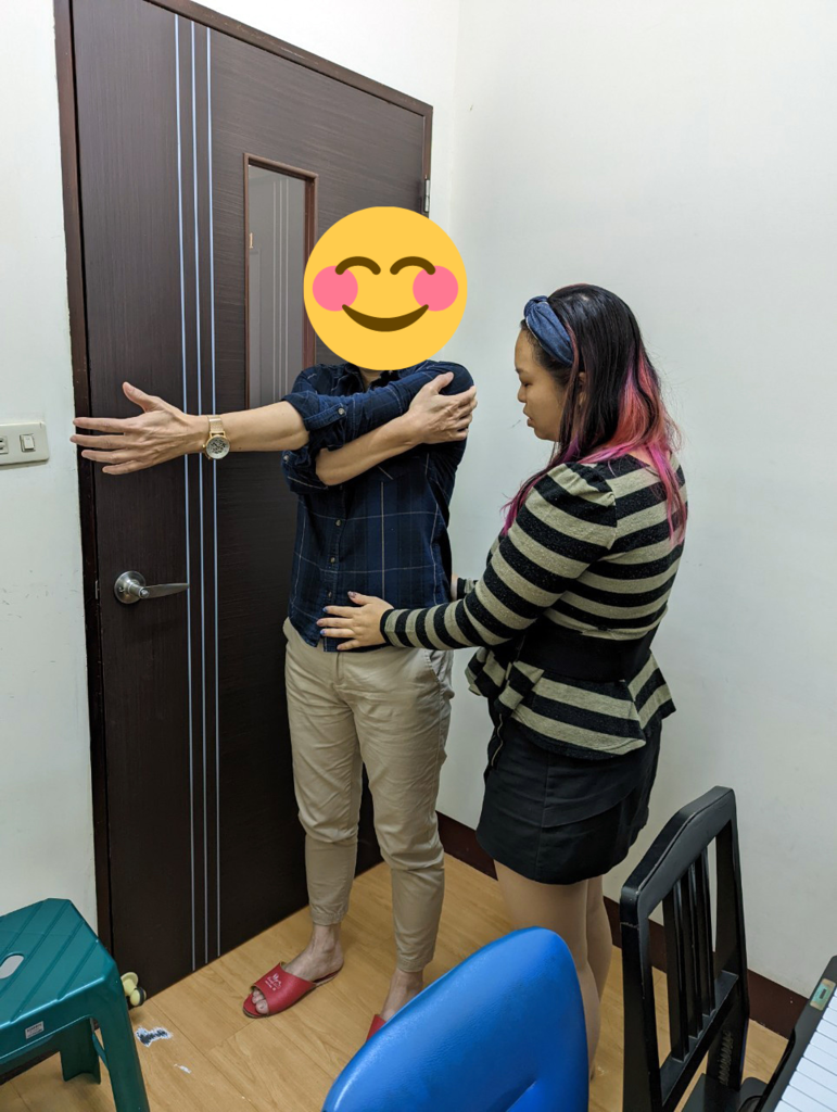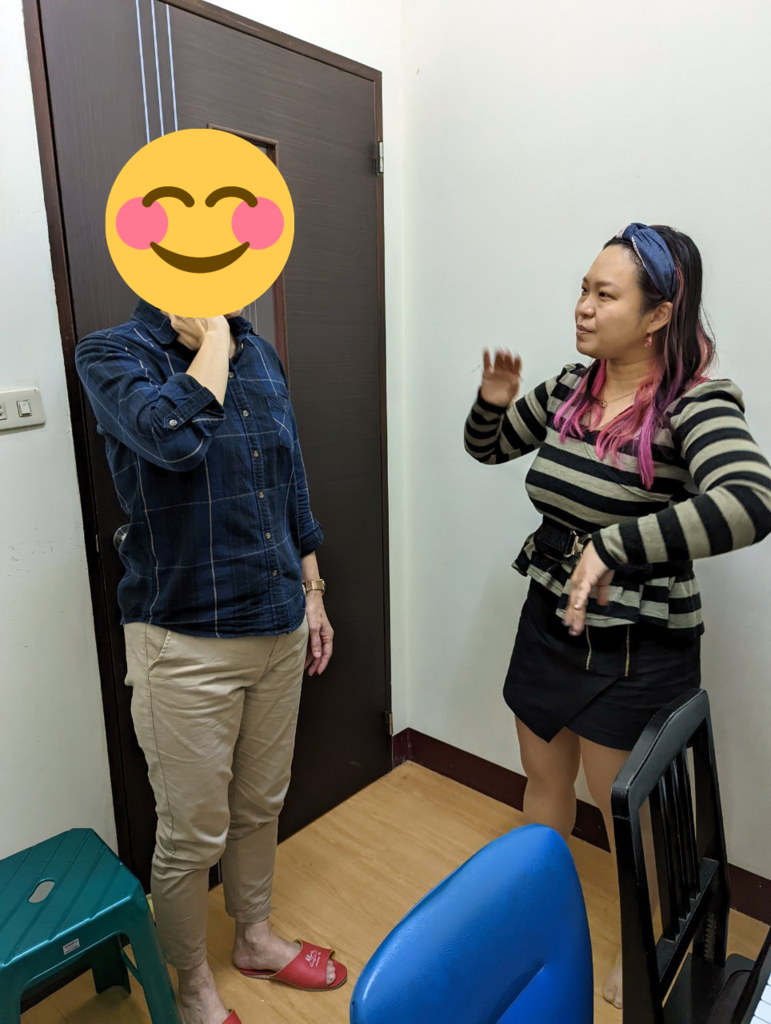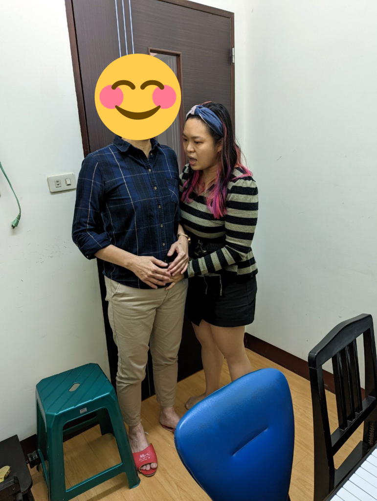 ▼朋友一直找不到感覺,所以老師用這個姿勢幫朋友找到出力點