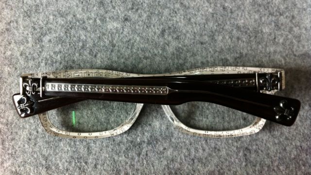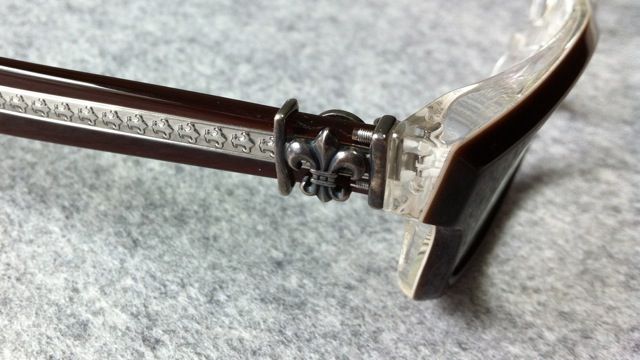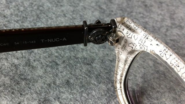 趁著新光三越週年慶,入手了這只 Chrome Hearts T-NUC-A CWC.T-NUC是蠻久的model,據老闆說-A就是亞州版本。而CWC是color code,某種深咖啡色。T-NUC-A和SPLAT-A蠻像的。也是在鏡腳的頭尾各放了fleur-de-lis。這只眼鏡可能是庫存挺久的,銀飾的部份都氧化的變成黑色了。說不定我應該去找拭銀布來讓他閃閃動人。連裡面都是黑的... 買的時候沒想這麼多,上網看到別的大大的分享,才覺得 怎麼這麼黑呢~價格挺貴的眼鏡,買來嘗鮮搭配是蠻好的。但要是要求細緻度的話,說不定Cartier會是比較好的選擇,以相同價位來說。