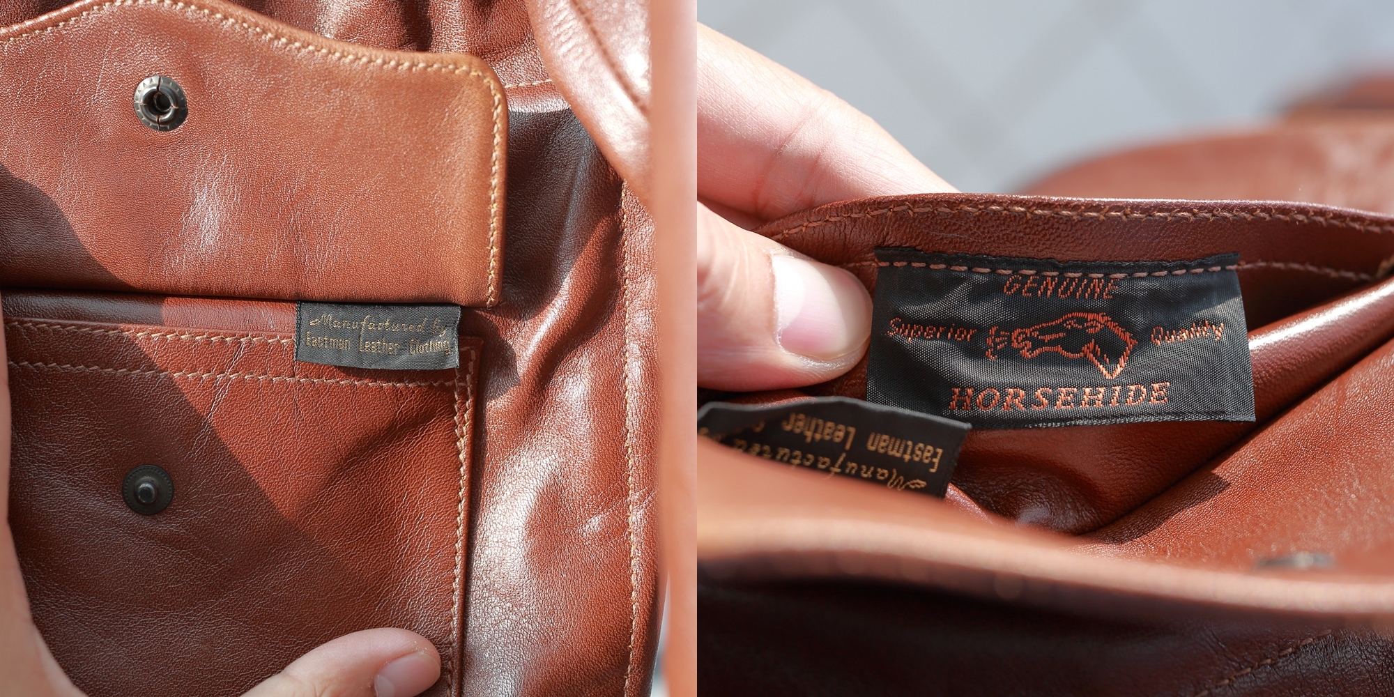 ↑左身口袋內有兩個標,一個是Manufactured by Eastman Leather Clothing;另一個則是馬皮材質標籤GENUINE HORSEHIDE Superior Quality.