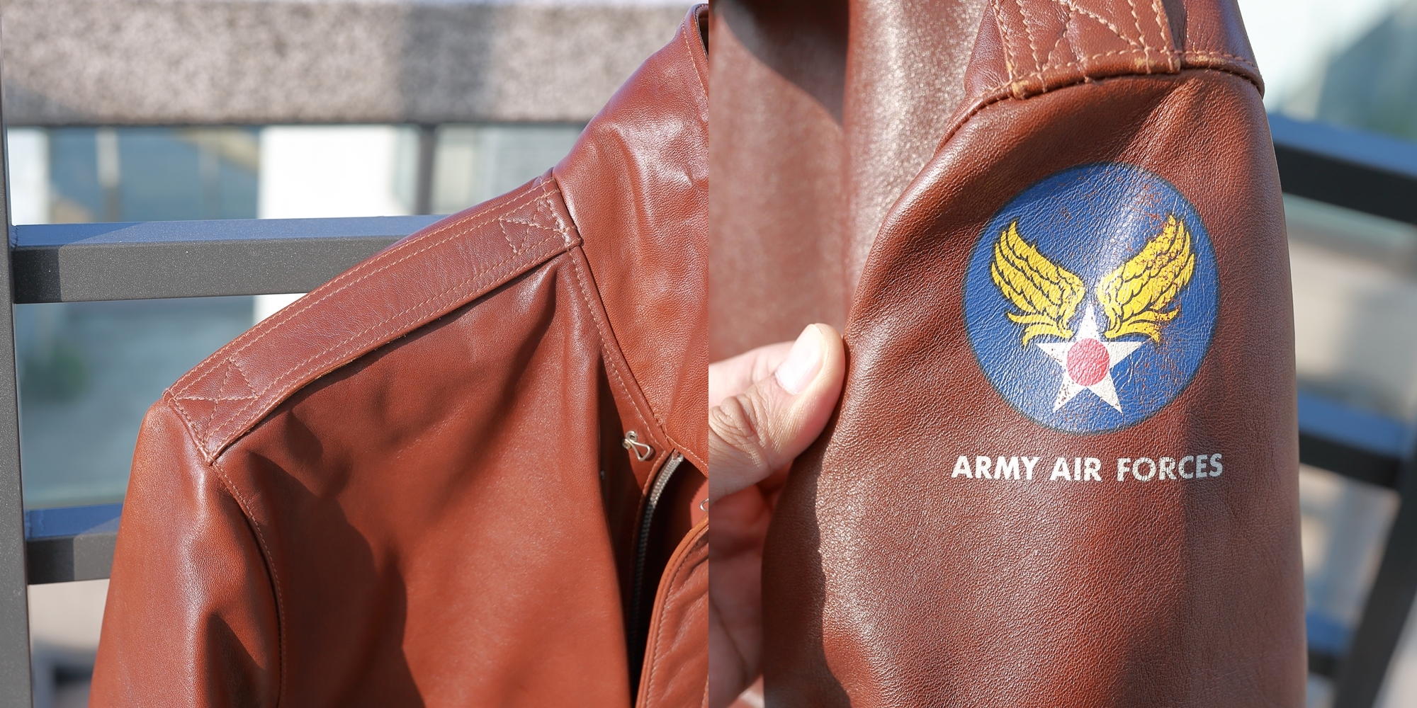 ↑內裡中央處有印刷352ND FTR GRP(352nd fighter group的縮寫);另外前襟擋風片大概胸口的位置有一個ARMY AIR FORCE的logo。