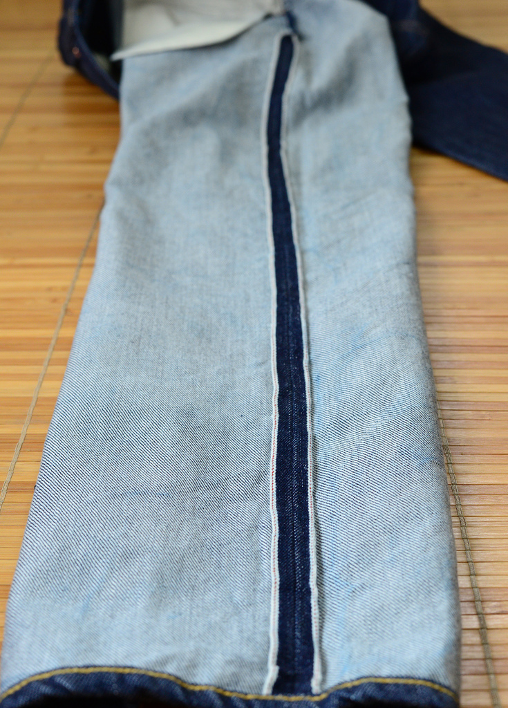 翻到內裡一看,布邊的設計是玩真的,貫穿整件褲子,而不只是在褲腳做做樣子。
