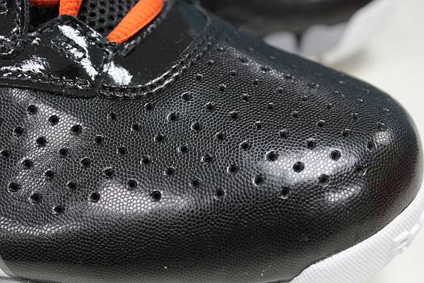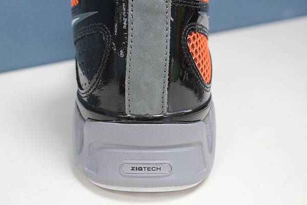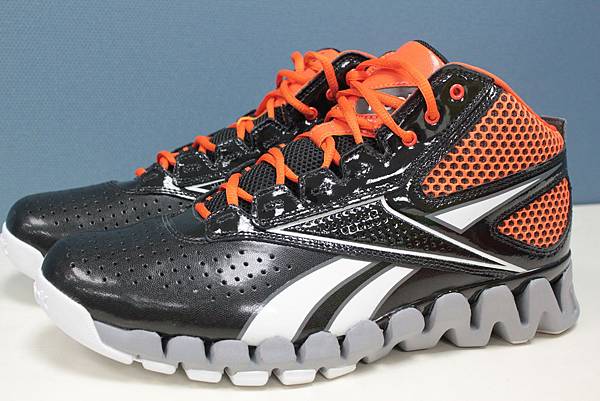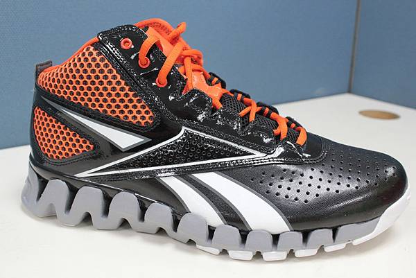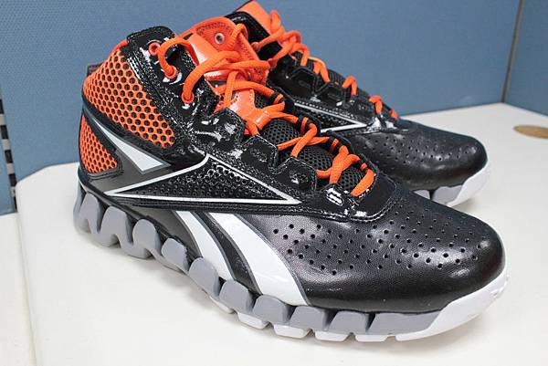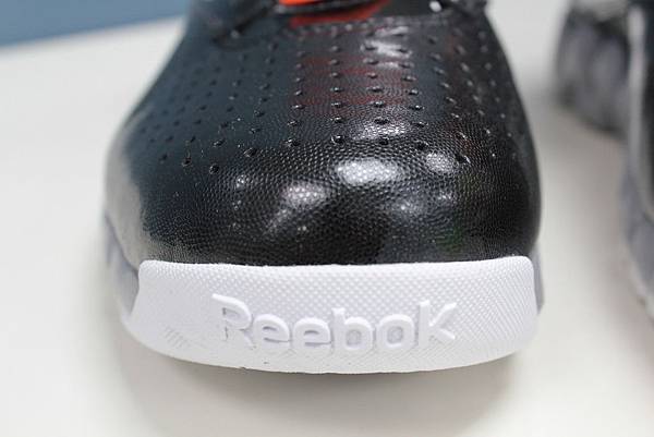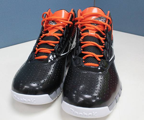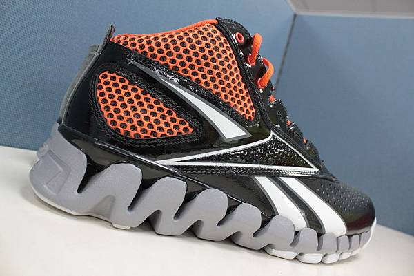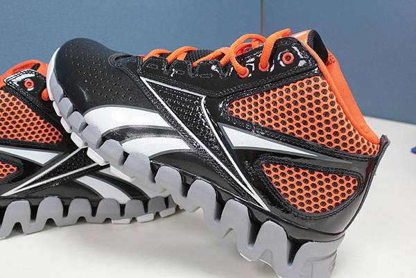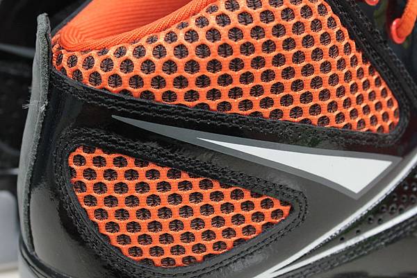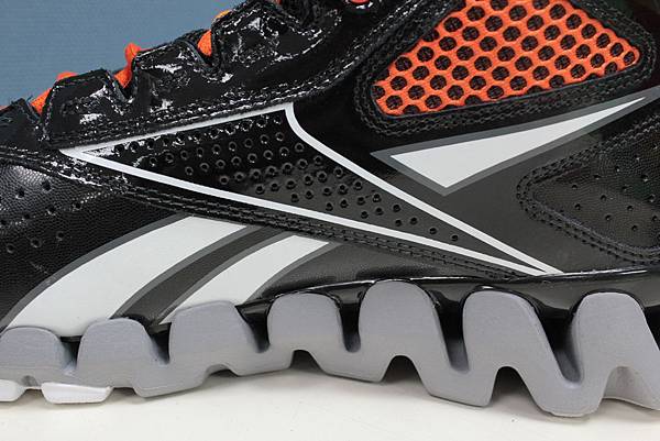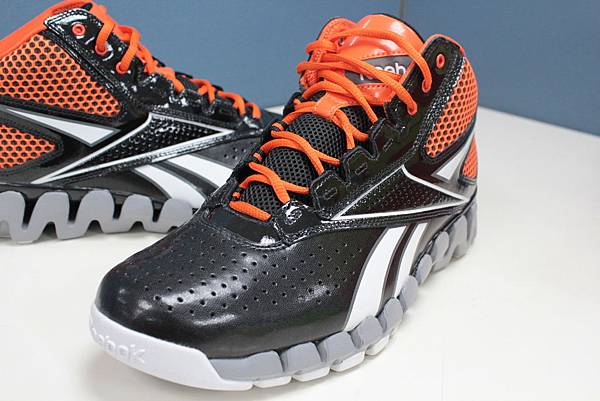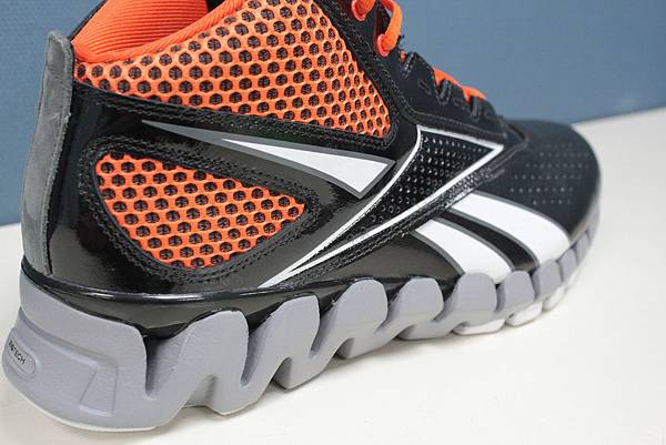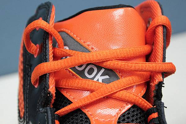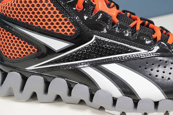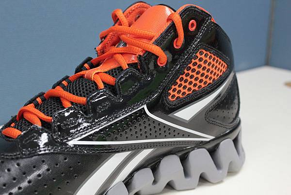 另一個重點則是這雙ZigTech籃球鞋提供了非常多的透氣設計,從鞋頭上的棋盤狀排列,到鞋側Logo的中間三角地帶,到鞋舌部分的黑色透氣布,再到巨大的橘黑網布組織,可以想見Reebok在維持透氣度、排汗功能上所做出的努力,而這些星羅棋布的透氣孔並沒有因此影響了整雙球鞋的流線線條,反而在亮面黑橘戴白色的色彩搭配下,呈現一種更為細膩的整體感。