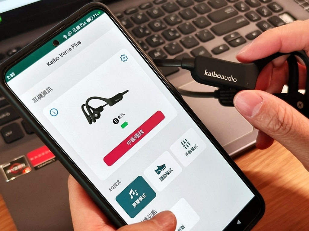Kaibo Verse Plus骨傳導藍牙耳機還有專屬的APP,提供了原聲模式、運動模式跟手動模式可以依照使用的環境去設定,這真的非常的實用,APP上一樣會顯示目前耳機的電量,隨時掌握使用狀況。