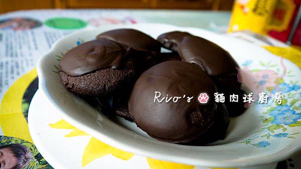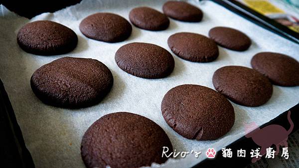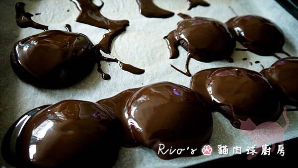 9.烤好餅乾後放涼,將巧克力醬淋上餅乾。