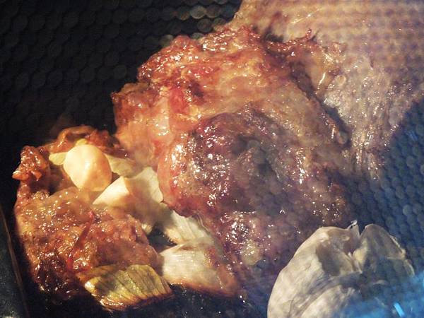 在烤盤鋪上洋蔥,提供甜味也不讓牛肉直接接觸高溫的烤盤,也墊高讓牛肉不會泡在烤出來的油及肉汁中,烤出來效果更好。