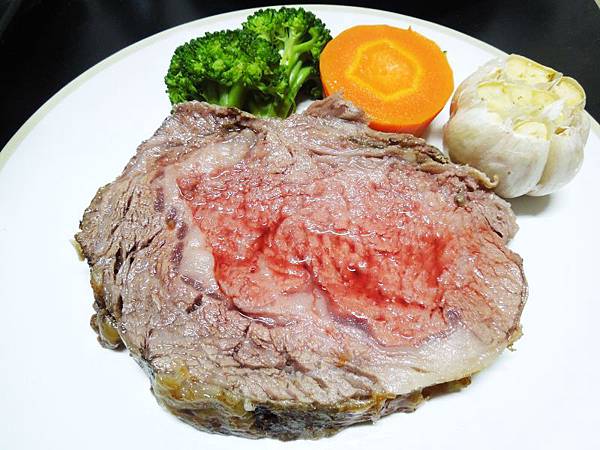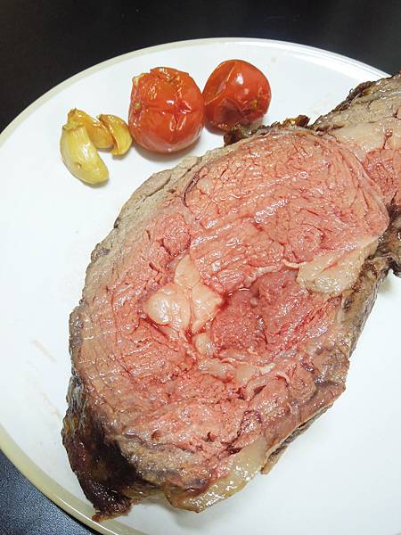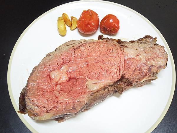 130度熱風烘烤100分鐘,時間比上次短了一點,熟度大約是五分熟,肉質軟嫩、多汁鮮甜的慢烤肋眼牛排完成!