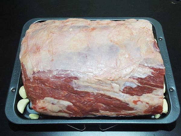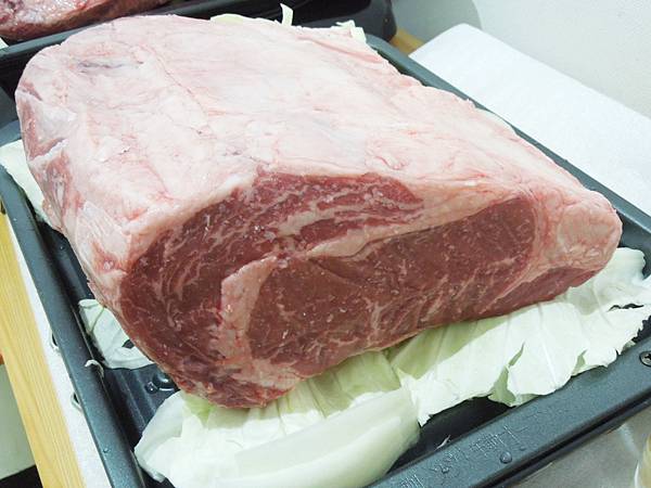 這塊原裝的牛肉是屬於原料,一般會依用途在分切修整,如果是要煎牛排,切片後要把旁邊多餘的油脂修掉,但是因為這次是要做慢烤牛肉,旁邊的油脂剛好可以保護牛肉不會變的乾柴,所以特別留下來,要上桌的時候才修掉。