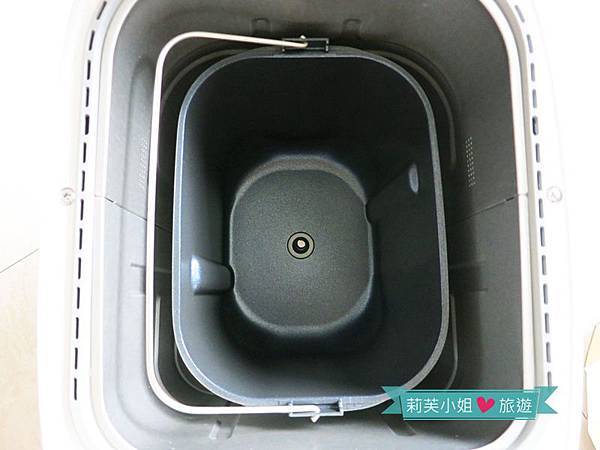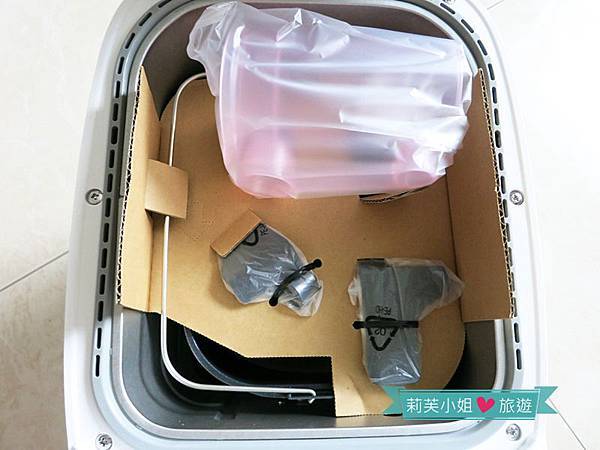 將第二個蓋子打開,出現了麵包葉片跟麻糬葉片、量杯跟湯匙。