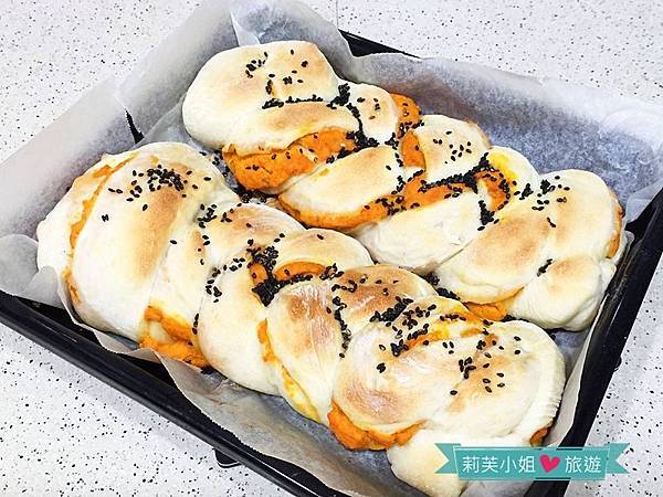地瓜泥辮子捲麵包,料多到滿爆漿的地瓜泥,是一項對腸胃極好的麵包。