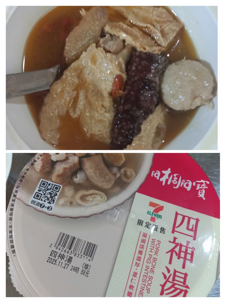 HermesParis wrote:超可怕 ! 滿滿的 ...(恕刪) 本來想買來嘗鮮的!但看到這篇說科技與狠活!但想想薑母鴨店也是差不多有某種程度上的相同!只是有無標示的這麼詳細爾已!剛剛去家的附近看剛好有~(剩二碗)先說 : 可以買~像我這種單身~找不到朋友去吃或是晚上冷肚子餓想暖暖胃的!可以買1.湯頭濃郁!不會過辣(薑片放太多)或是酒味過重(剛剛好)2.肉有好幾塊都是沒有骨頭的!然後有一塊是大塊的3.一片豬血4.小(貢?魚?)丸5.豆皮6.薑片我有吃不會有渣渣