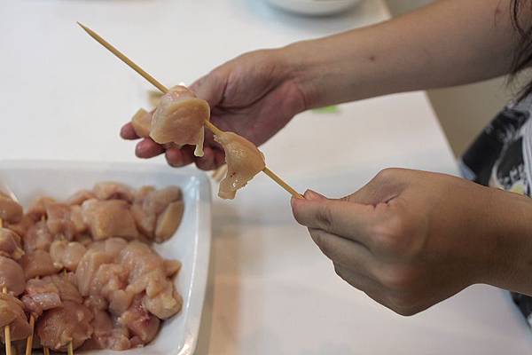 再串在一起……雞肉串的部份就完成囉!要烤之前的20分鐘再放進醬裡醃就好了。