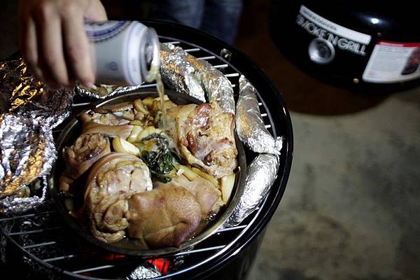 「煙薰慕尼黑豬腳」這道菜,最重要的就是在燒烤的過程(約一小時)中,要分成四次澆上藍妹啤酒,一次添加一罐。