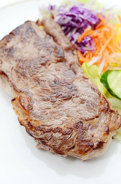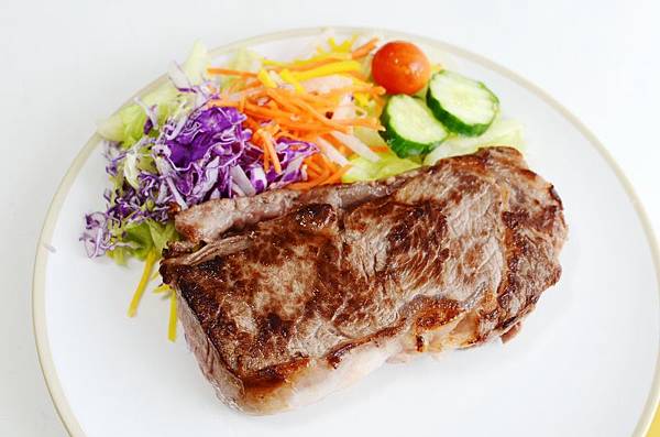 冷鍋無油,低溫慢煎的原味牛排,撘配蔬菜,整個很健康。