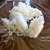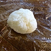 1.取適量的白飯於保鮮膜上,撒上些許鹽後將白飯緊捏成團狀。