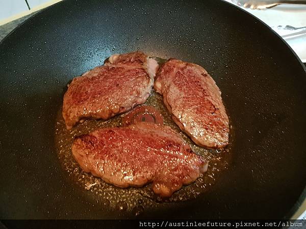 先下一些牛油,讓鍋子裡本身有一些牛油,然後下牛排