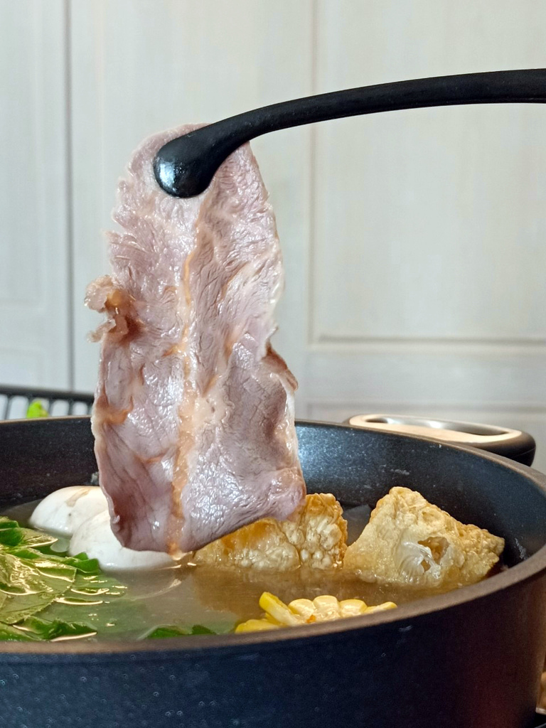 ▼火鍋時,伊比利豬的果香混合我們的蕈菇湯頭,吃起來清甜鮮嫩,十分開胃