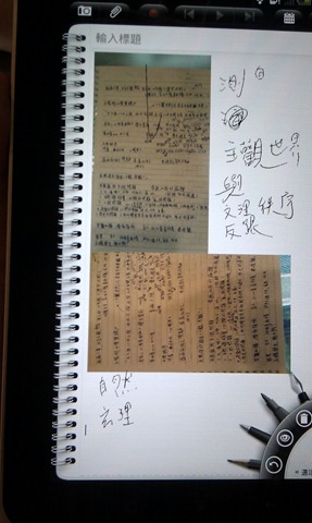 手寫有感壓,雖然不是很明顯,用慣WACOM版跟PHOTOSHOP配合的我覺得這應該頂多256階而已,雖然沒有很好,不過也還OK。字其實不能寫得像一般紙本那麼小,應該是筆頭的關係,平常我們用0.38、0.5等原子筆筆尖都比Flyer的觸控筆細得多。不過寫起來當然是比市面上的所謂「電容觸控筆」好得太多太多了。我本來還在擔心說這隻筆寫上去硬質玻璃會不會有卡卡或是有恐怖的聲音(你可以想像一下兩個瓷盤互相摩擦的聲音)但實地用起來倒是沒什麼感覺,寫起來感覺就是…一隻觸控筆。剛開始寫有些不習慣,不過寫一陣子就ok了。右下角的筆可以存檔,也就是說你可以設定好幾隻你習慣用的筆(筆跡、粗細、顏色等等)然後直接點就會換了,會存檔著。字不太好寫好,會比平常大,不過照相可以直接把筆記照下來,近拍文件效果很不錯,可以直接在上頭畫重點寫東西,效果不錯。