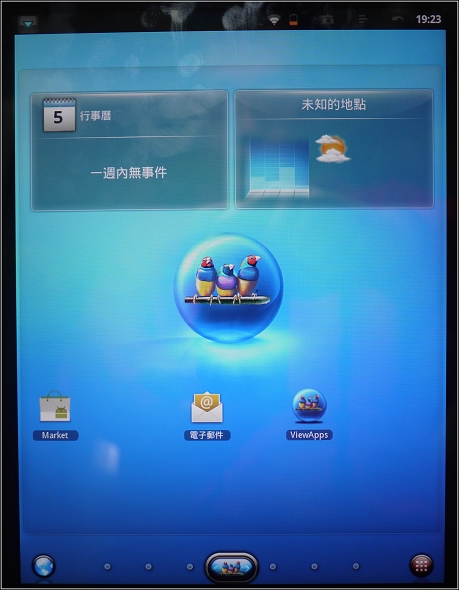 由於ViewPad 10無法透過Android SDK截圖,而且也沒辦法Root透過軟體擷取畫面,畫面只能透過相機拍攝,請大家包涵。ViewPad 10e的主畫面是以客製化過的「ViewScene 3D」組成,共有七個頁面,左右拖曳時會有3D效果,在視覺上蠻炫的: