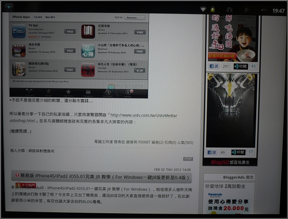 ViewPad 10e的瀏覽器支援Flash 10.3,可正常瀏覽內嵌Flash元件的網站,並支援多點縮放,由於IPS面板加持,可視角很大字體也很清晰,在瀏覽網頁這部分效果不錯: