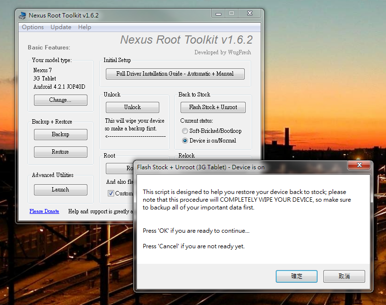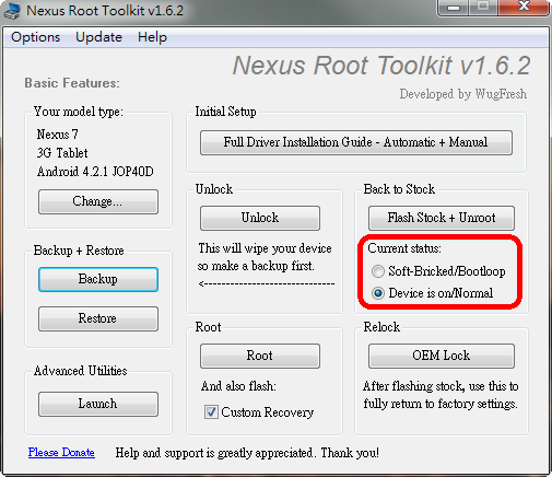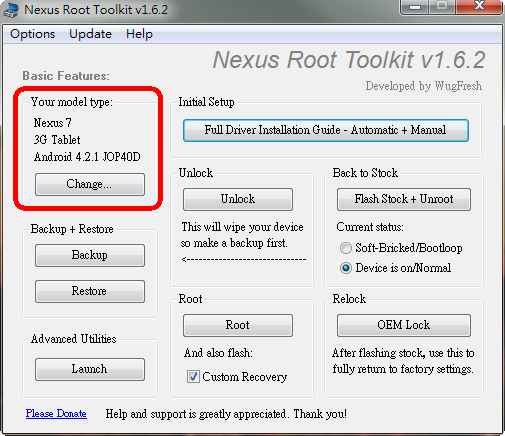 這次用的工具是由WugFresh開發的Nexus Root Toolkit (以下簡稱為NRT), 算是一款比較知名度高的Nexus系列產品Unlock+Root工具, 絕大部分Nexus系列產品都可以靠這套工具來Unlock+Root+Unroot+Relock。