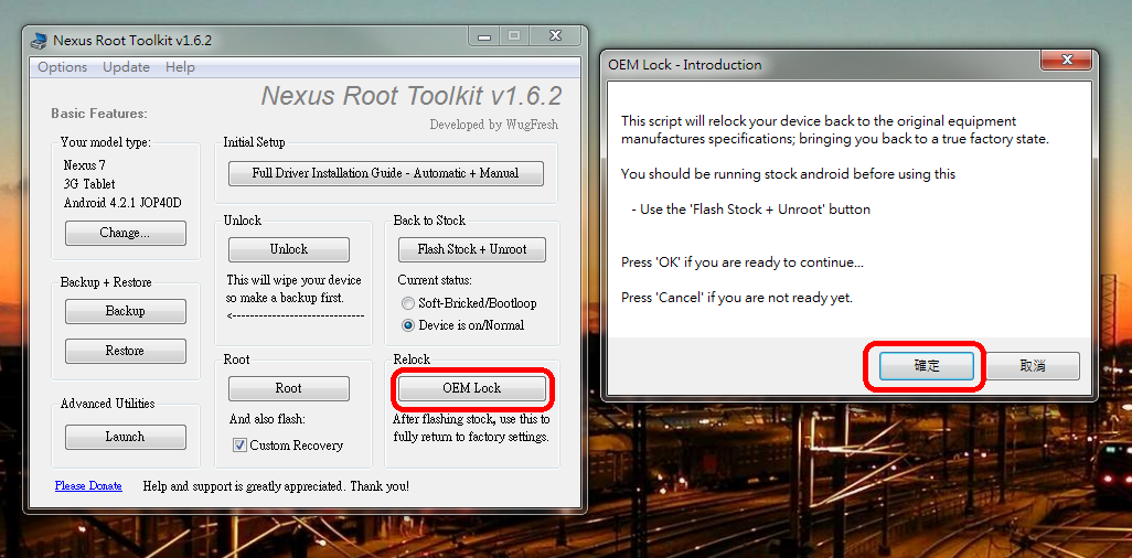 將Nexus 7用USB線連接電腦, 確認所有Drivers及ADB interface已經安裝好後在NRT中按下Unlock -> 確定。
