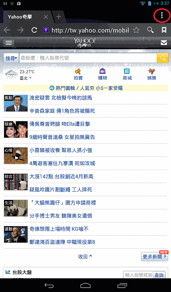 ppta0361 wrote:沒找到耶 三個直立白點在那個位置呢? 謝謝 您還是沒看到 menu 選單鍵嗎?Google Play 商店、瀏覽器、TuneIn、Life Image、YouTube、Zinio.....menu 選單鍵就在...右上角!如下圖紅圈處:menu 選單鍵就在...右上角!“bbs reader”本身就沒有設計 menu 選單鍵請看 4 樓 kurowolf 兄的答覆。