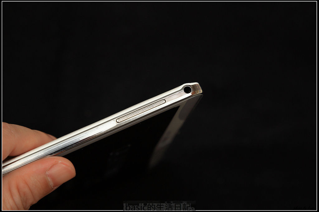 側邊的設計依然是如note3一樣 , 像是書本側面的設計風格 , 上端依序有電源鍵, 音量鍵與紅外線阜..