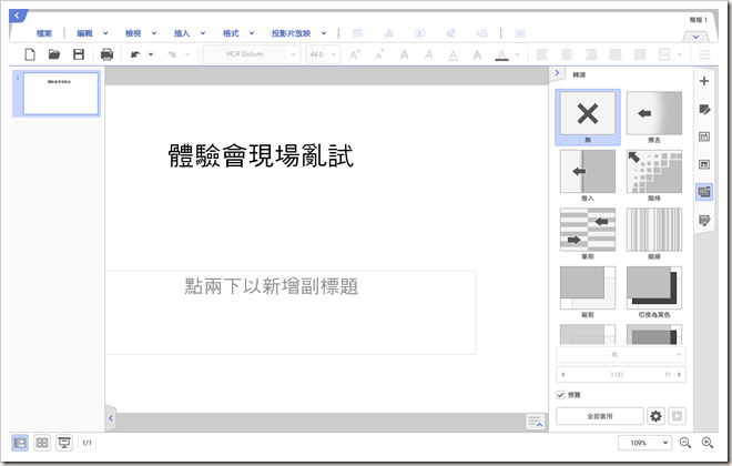 以HShow來說,也跟Powerpoint一樣,提供轉場方式設定。