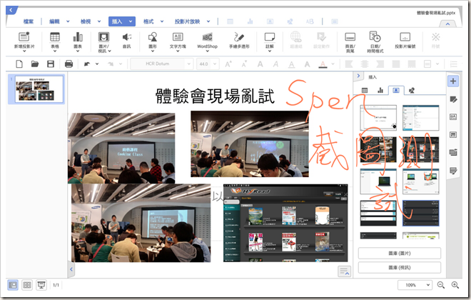 我在體驗時,也隨興地編了一頁簡報檔,並同時測試S Pen的截圖功能。而這頁簡報檔我存檔後,回到家裡使用Powerpoint 2010開啟,也是沒有問題的。