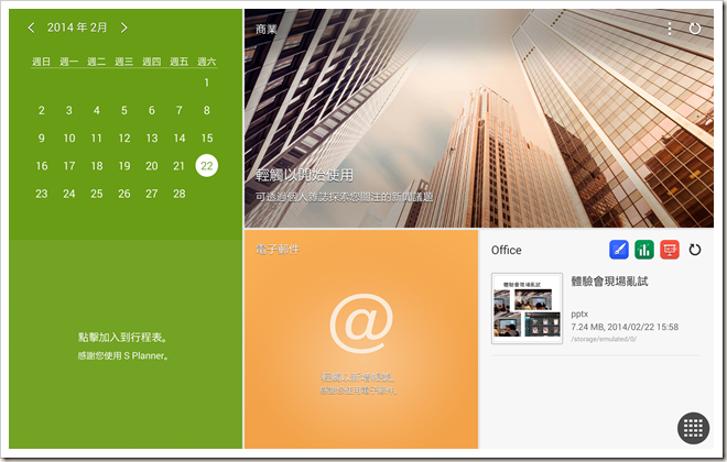 採用類似動態磚設計Magazine UX界面,分為6個方塊區,可以放上各式Widget。