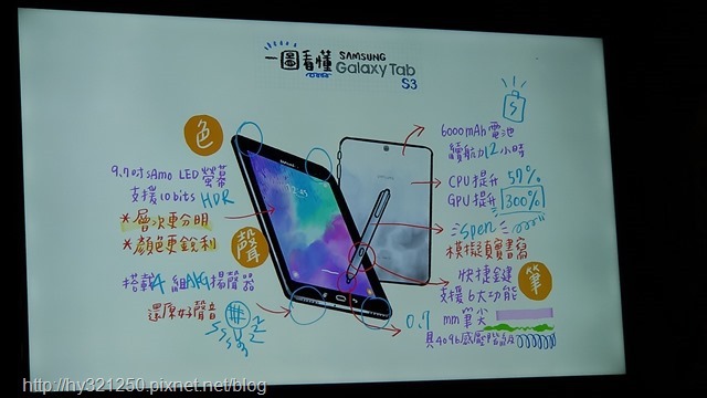 這次負責介紹Galaxy Tab S3平板硬體與重點特性的三星PM蠻有創意的,就用一張由討喜小姐使用Galaxy Tab S3隨附S-Pen手繪示意圖,讓大家一目瞭然地認識Galaxy Tab S3重要特性。