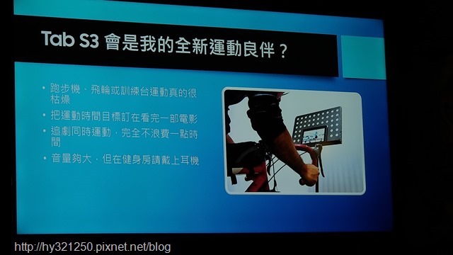 有了Galaxy Tab S3,Kisplay在他進行室內單車訓練台運動時,可以使用Tab S3邊追劇邊運動,就不像之前單純運動一下子就會覺得無聊了。
