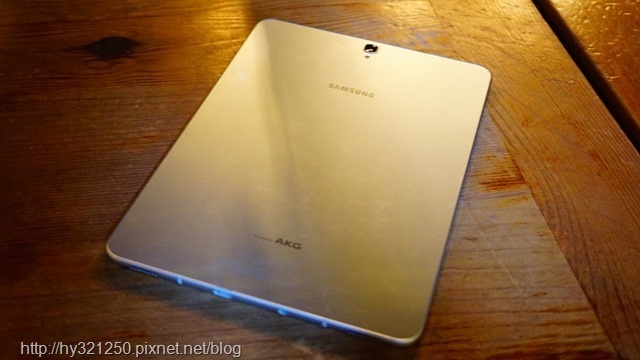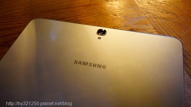 Galaxy Tab S3平板背面,使用金屬與玻璃複合材質設計,而邊框金屬則用了耐刮的鋁合金材質。
