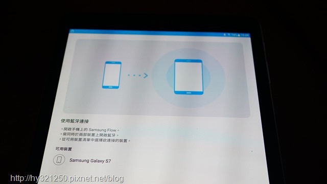 Galaxy Tab S3平板與手機可以透過藍牙或Wi-Fi Direct方式,點選在平板上顯示裝置,然後依指定步驟連接就可以了。