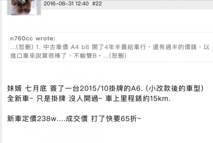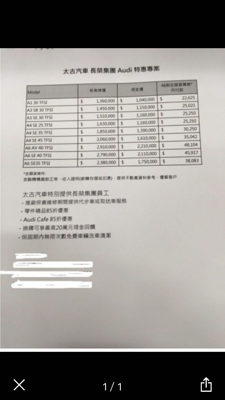 前幾天有去台北原廠中古部門問 A6 Sedan 35 TF 15年6月掛牌的試乘車 小改款過的 跑了5千多辦到好165W 保險是丙式跟百貨都用到好 免費更換第一次油想問一下各位大哥價格上還有空間嗎?感謝大家!!