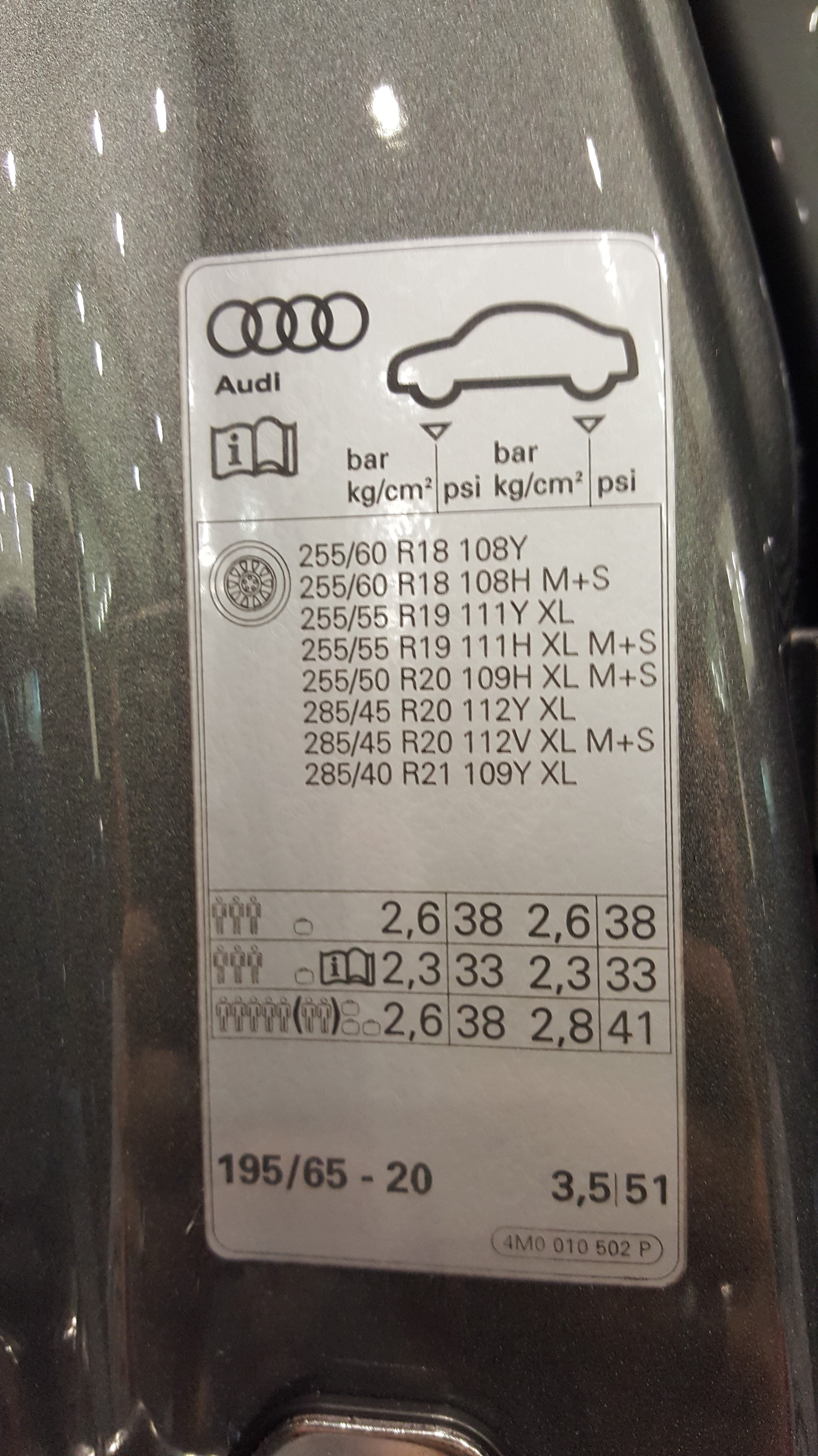 這是打開Q7駕駛座車門可以看到的原廠輪胎規格(還有建議胎壓)貼紙,僅供參考,新同學Jimmy兄就豪邁地上了22吋大腳。