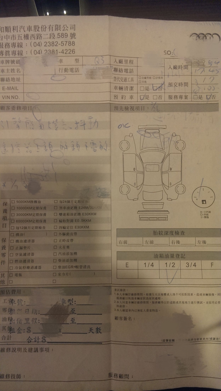 我是Q3 1.4的車主1)所有的問題都是個案,你都是第一個發生!我的車滿2年,發生過廢氣燈亮失去動力,修了11個月。修的過程車子怠速變得震動很大(麻),修了超過一年,下個月還要再回去,但是跟我說目前束手無策...其他小問題2、3個,都是要至少一個月才能完修!2)勉強3)沒遇到4)會拖...真的拖...我的車躺在廠內加起來超過半年....