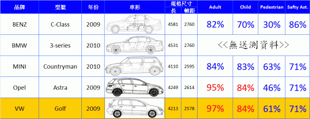 kindergartens wrote:外形醜醜的(有點主觀...(恕刪) 外型的確是很主觀的東西, 就像名牌包一樣.不需講太多, 不喜歡就是沒辦法; 喜歡的人, 大有人在!不過, 車子也像是3C商品一樣, 比性能, 比安全性, 比內裝也比C/P 值... 這些客觀項目.一位前輩的一句話, 讓我謹記在心: "沒有健康煙" (i.e. 開車上路就有一定的危險性)所以, 比車子我喜歡從安全性出發!主動性安全配備:1. ESP, Golf 全車系標配. (北美上市的車輛, ESP 必為標準配備)ESP 介紹1ESP 介紹22. ASR, BAS, EBD... 等等. (車款不同配備略有不同)被動性安全配備:1. 6 or 7 SRS2. EURO NCAP 撞擊測試5 顆星 <詳見比較表>車子的安全設計一定是與時俱進的,上表難免有上市/送測時間略不同,而有失公平性。但NCAP 在2009新制上路後,剛好可以有新的比較起點。Golf 安全性在同級距的車中,客觀成績一樣亮眼!為什麼比較表中都是進口車?其實我一直很想把國產車納入比較表中,只是配備2A 跟無ESP 的比較實在有失公平。另外,最重要的是,主、被動安全性配備都不及安全的駕駛觀念!
