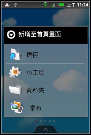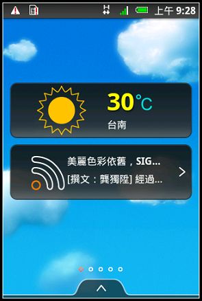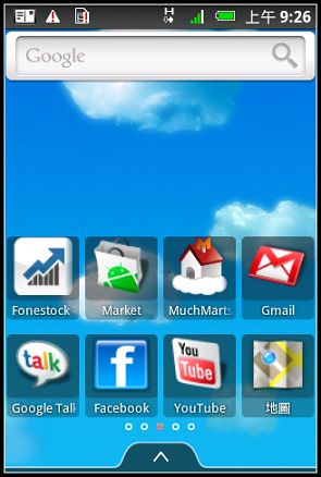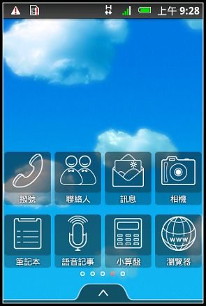 MUCHTEL A1在主畫面繼承了外包裝的「白雲飄飄」的設計感,也是以白雲襯底,從中間算起共有五個頁面可以自由使用(我覺得不太夠):