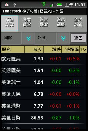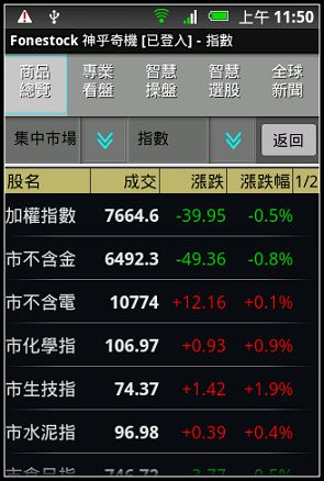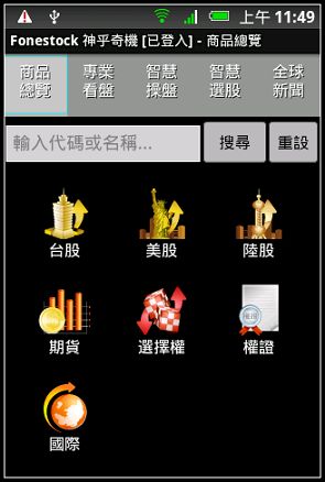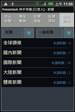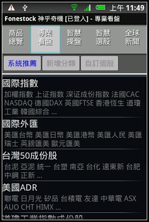 MUCHTEL A1另一個主打軟體---「Fonestock 神乎奇機」,神乎奇機在很久以前就是以作股票機聞名,所以在股票軟體的功能方面當然是相當完整,如大盤、個股指數、產業新聞等等都蠻完整的: