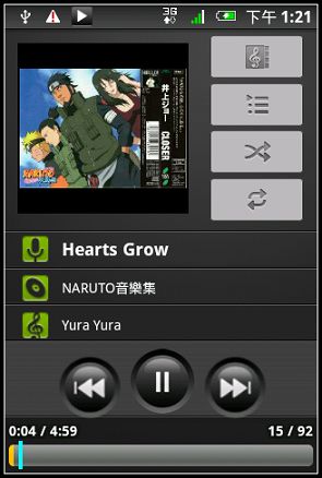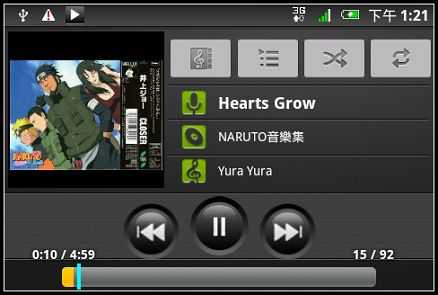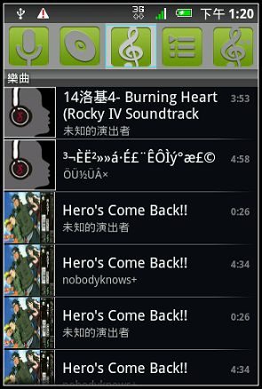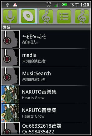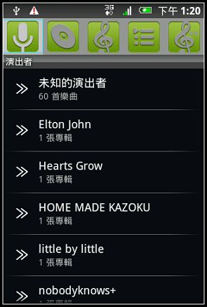 音樂播放也是Android 1.6的內建播放器,搭配耳機效果還不錯,共有演出者、專輯、樂曲、播放清單等模式可供選擇: