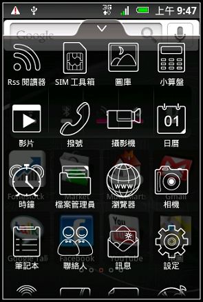 MUCHTEL A1預設程式集在頁面中以半透明的方式顯示捷徑,圖示部分也重新以黑白透明方式設計: