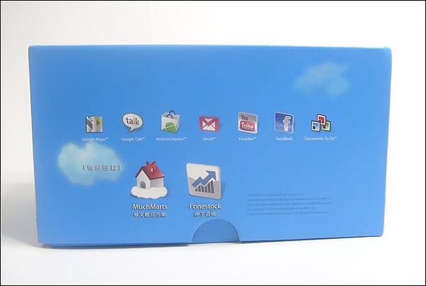 外盒側面來一張上面標記了MUCHTEL A1的大部分功能,其中比較客製化的軟體只有「MuchMarts數位市集」與「Fonestock神乎奇機」這兩個: