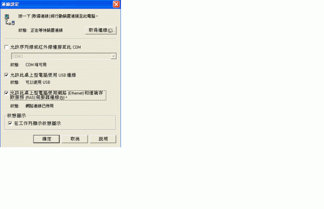想不到此問題引起不少的迴響, 好像有不少的受害者.到目前我用了好多方法, 包括更新windows及ActiveSync到最新版本, 也重開機好多次, 症頭還是一樣, 以紅外線連線是OK的, 但就是無法以USB連線, 怪怪!剛剛我從ActiveSync的<檔案><取得連線><下一部><說明><連線疑難排解員>, 得知在更新ActiveSync版本之後, 一定要(must)更新AvantGo Client Software, 請問各位先進, 這是甚麼東東? 有何用意? 因為以前沒聽過. 更新此東東就OK了嗎?無論如何, 感謝各位先進發表意見.CH Lin